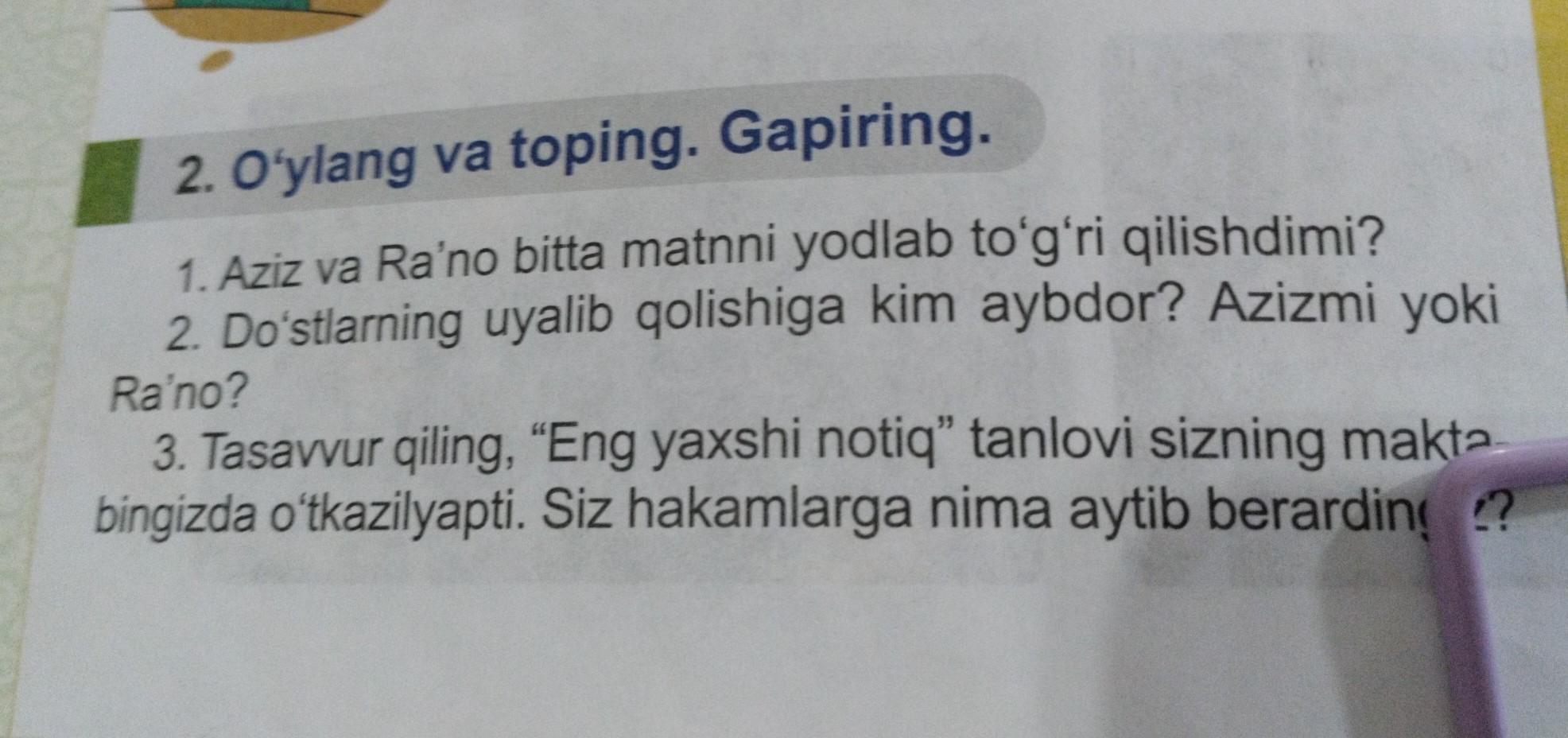 2. O'ylang va toping. Gapiring. 1. Aziz va Ra'no bitta matnni yodlab to'g'ri qilishdimi? 2. Do'stlarning uyalib qolishiga kim aybdor? Azizmi yoki Ra'no? 3. Tasavvur qiling, "Eng yaxshi notiq" tanlovi sizning makta bingizda o'tkazilyapti. Siz hakamlarga nima aytib berardinigiz ?