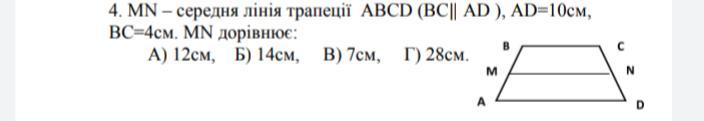 відповідь : середня лінія ( MN ) трапеції АВСD = 7 cм