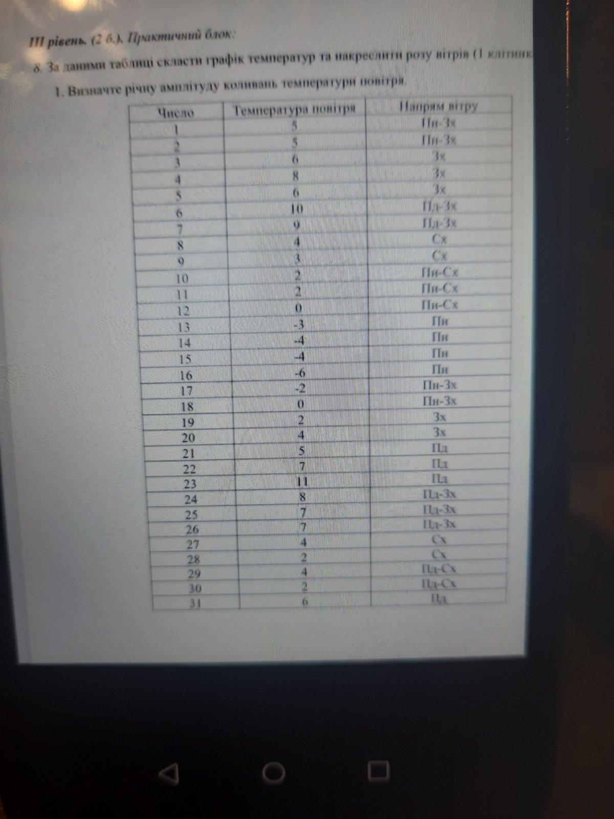 Щоб визначити річну амплітуду температури повітря, треба знати значення середніх місячних температур найтеплішого і найхолоднішого місяців. Різниця цих значень і є річною амплітудою температури повітря. Виходить: 11° - (-6°) = 17°