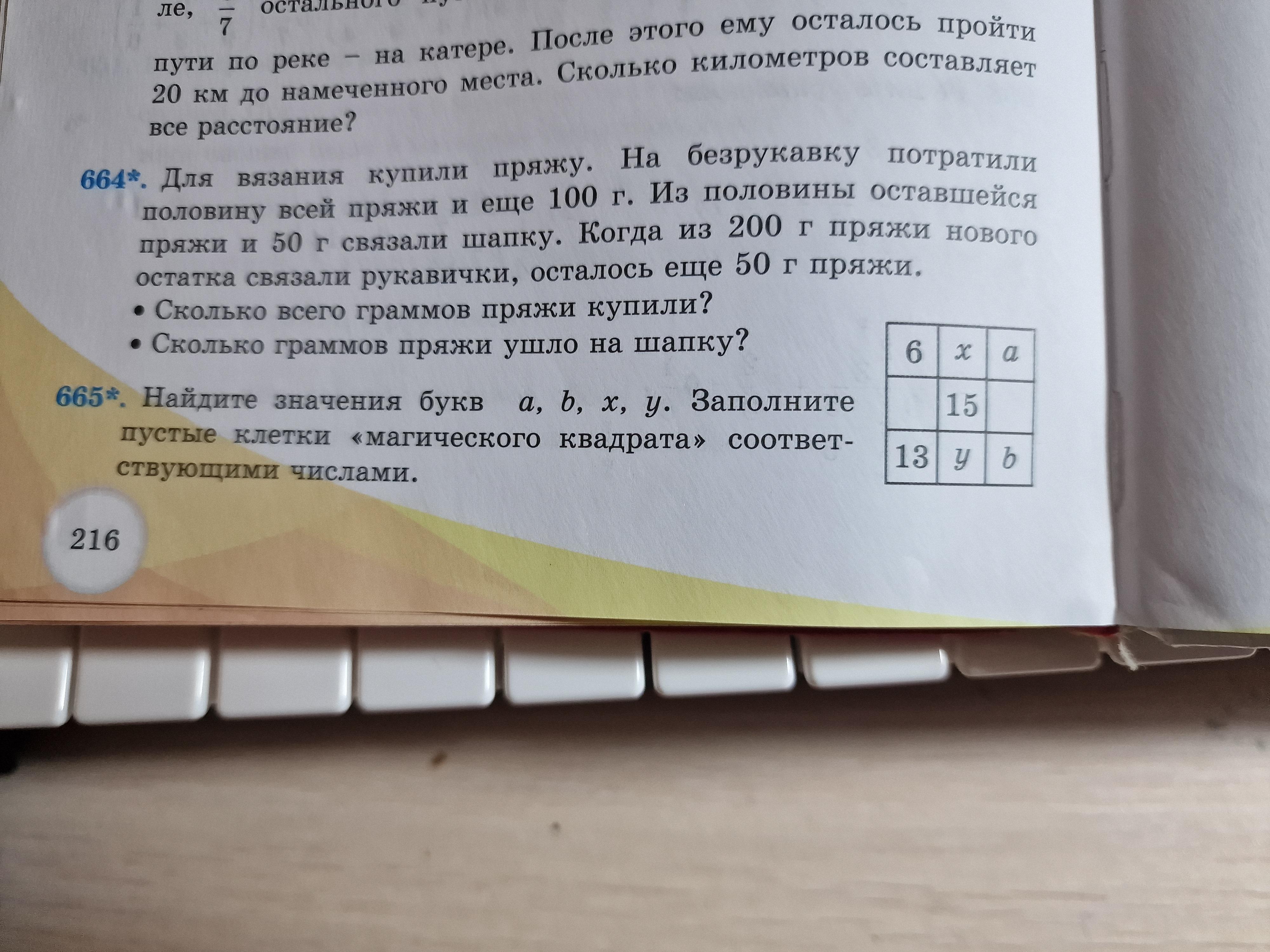 ПОМОГИТЕ ПОЖАЛУЙСТА 665 Найдите значение букв a,b,x,y. Заполните пустые клетки *магического квадрата*соответствующие числами