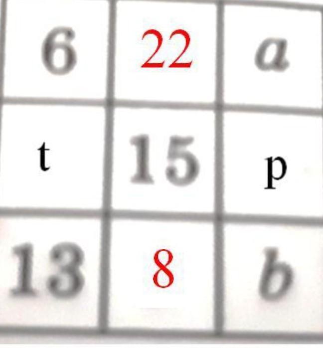 Тогда из 6+x+a=13+15+a получим x=22, а из 13+y+b=6+15+b получим y=8 (рисунок 2). Теперь можем определить число S: