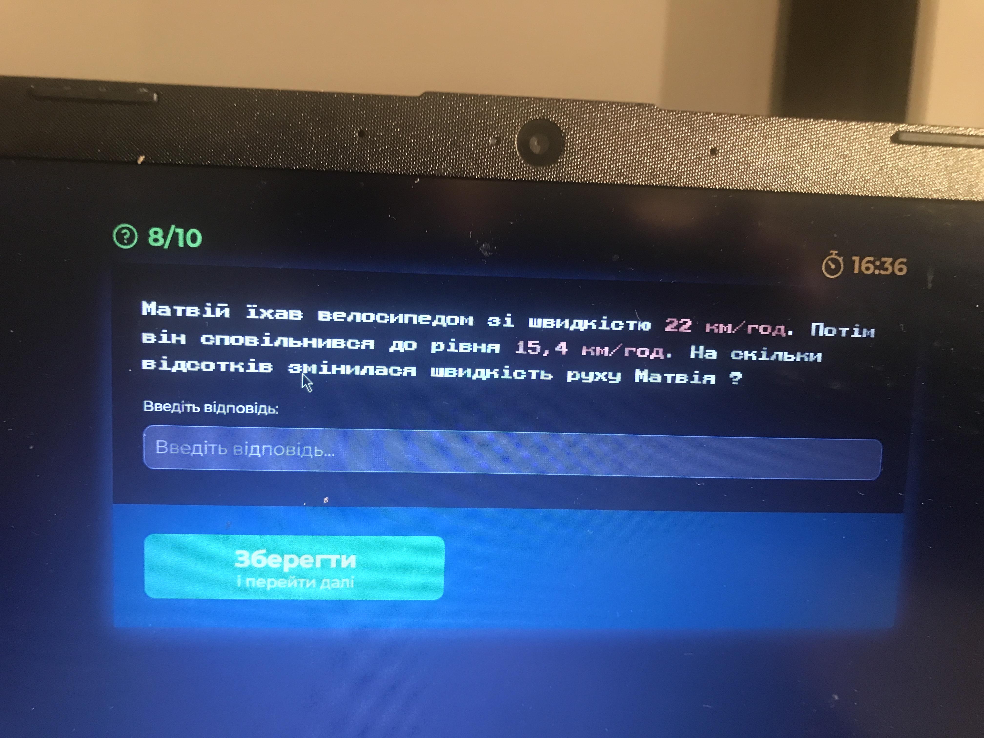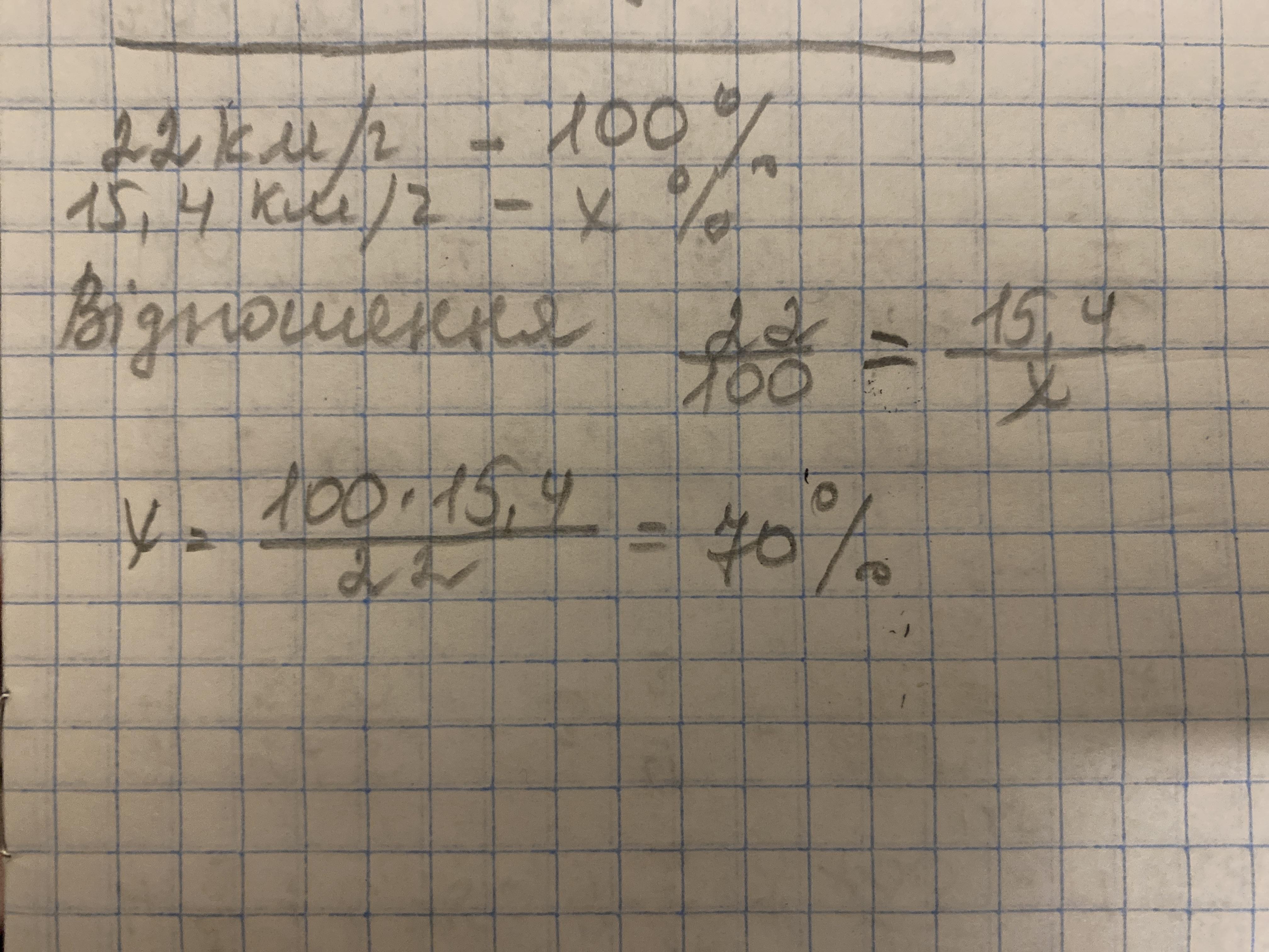 Швидкість руху Матвія змінилася на \(\frac{(22 - 15.4)}{22} \times 100\%\), що становить приблизно 29.09%. Таким чином, швидкість зменшилася на близько 29.09%.
