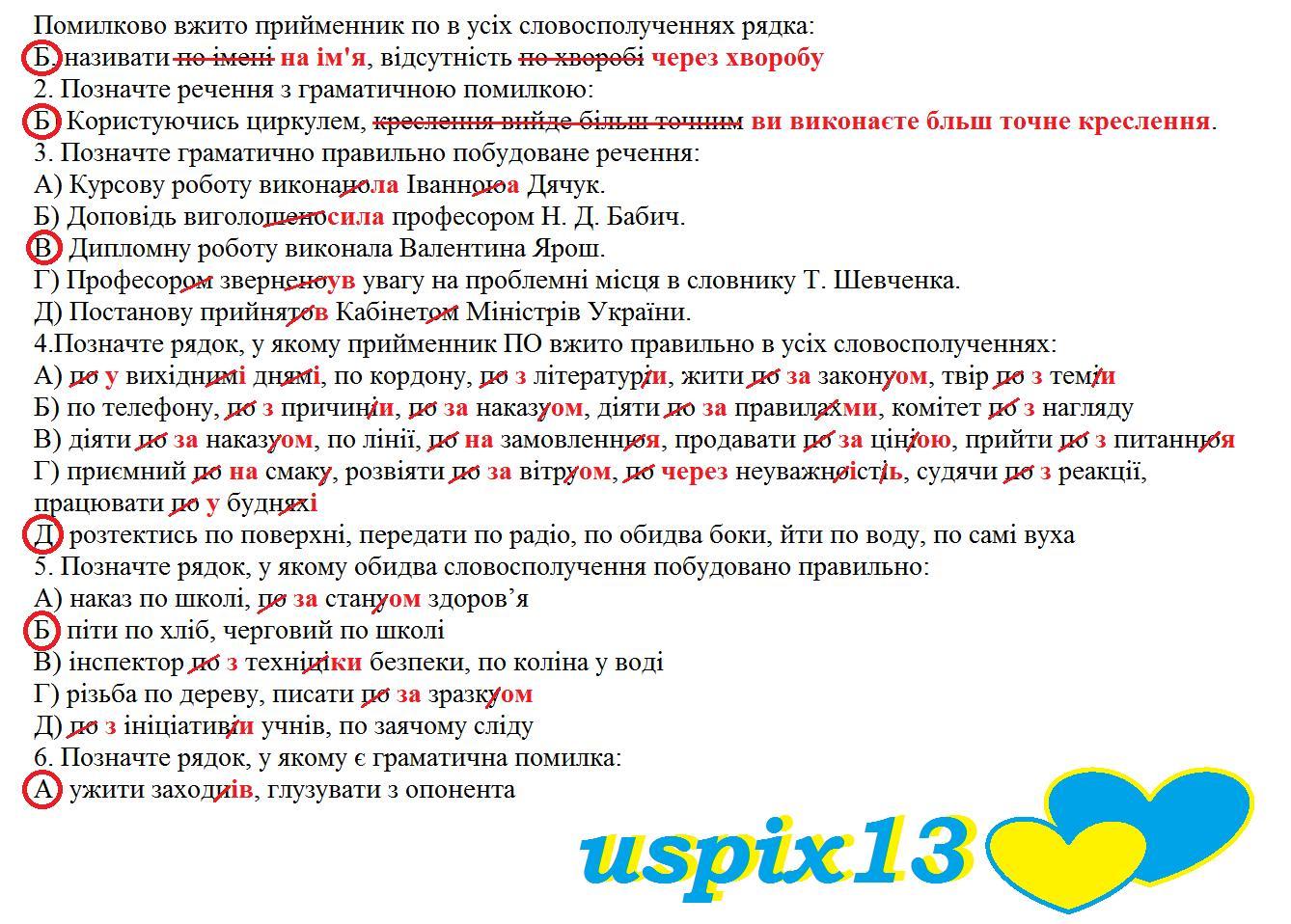 Помилково вжито прийменник по в усіх словосполученнях рядка: А. говорити по суті, ділити по справедливості Б. називати по імені, відсутність по хворобі В. піти по журнал, доповідати по черзі Г. ходити по кімнаті, чверть по сьомій (йдеться про час – 07.15.) 2. Позначте речення з граматичною помилкою: А) Повернувшись додому, ретельно вимийте руки з милом. Б) Користуючись циркулем, креслення вийде більш точним. В) Аналізуючи лексичне значення слова, звернись до тлумачного словника. Г) Ростислав Семків радить поступово ускладнювати своє читання, беручись за авторів «високої полиці». Д) Готуючись до іспитів, використовуйте освітні онлайн-сервіси. 3. Позначте граматично правильно побудоване речення: А) Курсову роботу виконано Іванною Дячук. Б) Доповідь виголошено професором Н. Д. Бабич. В) Дипломну роботу виконала Валентина Ярош. Г) Професором звернено увагу на проблемні місця в словнику Т. Шевченка. Д) Постанову прийнято Кабінетом Міністрів України. 4.Позначте рядок, у якому прийменник ПО вжито правильно в усіх словосполученнях: А) по вихідним дням, по кордону, по літературі, жити по закону, твір по темі Б) по телефону, по причині, по наказу, діяти по правилах, комітет по нагляду В) діяти по наказу, по лінії, по замовленню, продавати по ціні, прийти по питанню Г) приємний по смаку, розвіяти по вітру, по неуважності, судячи по реакції, працювати по буднях Д) розтектись по поверхні, передати по радіо, по обидва боки, йти по воду, по самі вуха 5. Позначте рядок, у якому обидва словосполучення побудовано правильно: А) наказ по школі, по стану здоров’я Б) піти по хліб, черговий по школі В) інспектор по техніці безпеки, по коліна у воді Г) різьба по дереву, писати по зразку Д) по ініціативі учнів, по заячому сліду 6. Позначте рядок, у якому є граматична помилка: А) ужити заходи, глузувати з опонента Б) говорити англійською, доглядати хворого В) дотримати слова, одружитися з однокурсницею Г) завдавати болю, дивуватися з поведінки Д) не звертати уваги, навчатися музики 7