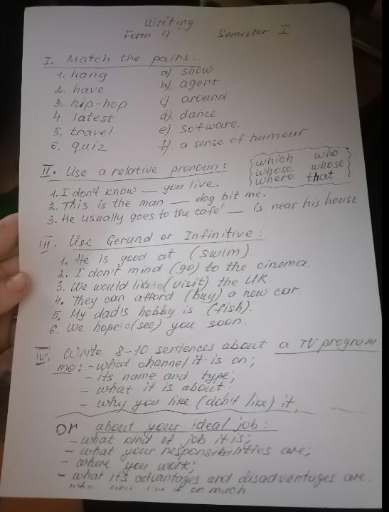 1.c)2.f)3.d)4.e)5.b)6.a)1.where 2.whose3.which1.swimming 2.going3.to visit 4.buying 5.fishing 6.to seeHonestly, I am not a big fan of such activity as watching TV, but I know some programs. It has broadcast on “Inter” channel for 11 years and because of war it stopped. This program is called “Oryol i Reshka”. This is Ukrainian TV show that launched in 2011. It is hosted by two co-hosts. They are exploring a different global location every weekend. Through a coin toss, one host gets the Golden Card with is unlimited credit, while the other spend the weekend with only US$100. Since the second season, the show has hidden $100 in a bottle at each visited location for travelers to discover. I find "Oryol i Reshka" fascinating because of the dynamic between the hosts adds an exciting twist, making it interesting to see how they navigate their contrasting budgets while showcasing beautiful destinations worldwide, adding an element of adventure and exploration to each episode.