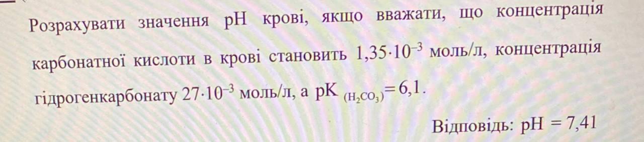 pH=6,1+log([HCO3-]/ [H * 2CO * 3] ) Значення концентрацій [HCO3-] i [Н2СО3] підставляємо з умови задачі: