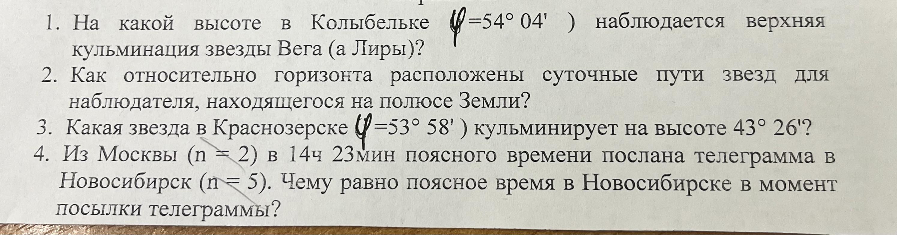 3. Какая звезда в Краснозерске (=53° 58') кульминирует на высоте 43° 26'?