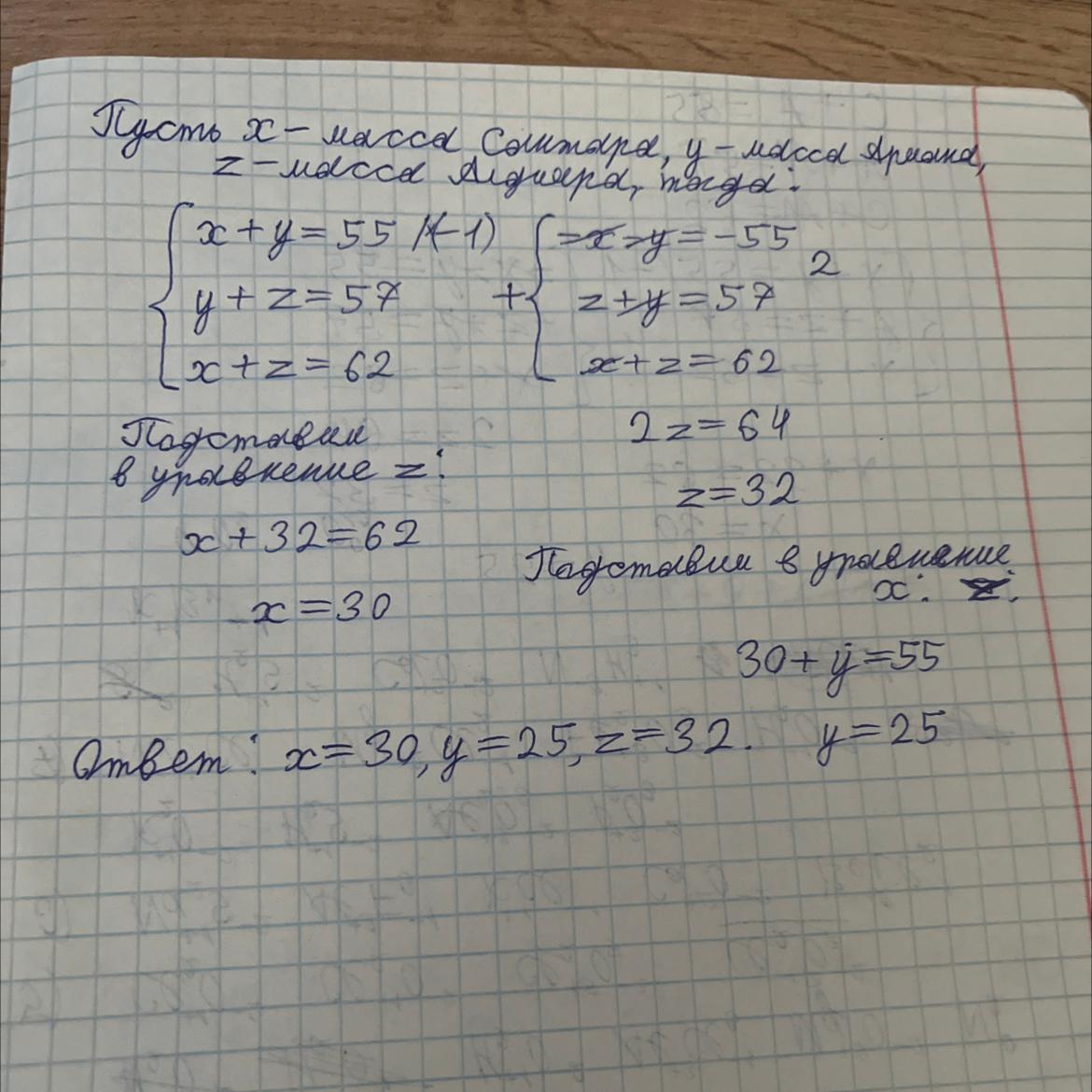 Общая масса Санжара и Армана 55кг. Армана и Алдияра 57кг. Санжара и Алдияра 62кг. Какова масса каждого мальчика?