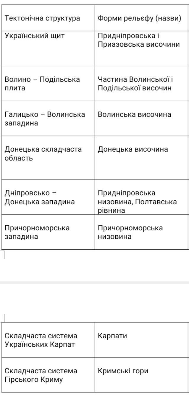 Установіть відповідність між формами рилефу України та їх тектонічними струкурами
