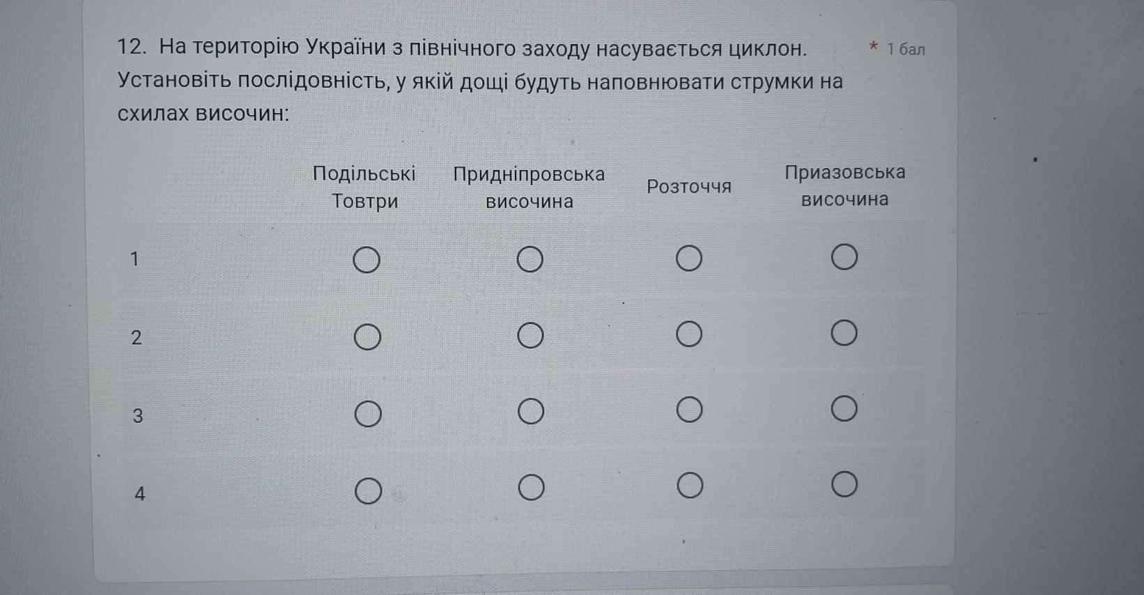 12. На територію України з північного заходу насувається циклон. Установіть послідовність, у якій дощі будуть наповнювати струмки на стилах височин