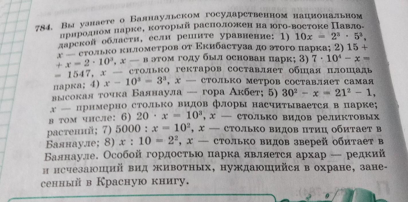 23 дарской области, если решите уравнение: 1) 10х 784. Вы узнаете о Баянаульском государственном национальном природном парке, который расположен на юго-востоке Павло столько километров от Екибастуза до этого парка; 2) 15- столько гектаров составляет общая площадь столько метров составляет самая гора Акбет; 5) 30² - x = 212 -1, примерно столько видов флоры насчитывается в парке- + x = 2 . 103, х 1547, х 33, x - парка; 4) х - 103 = высокая точка Баянаула 103, x = столько видов реликтовы = в том числе: 6) 20 . х растений; 7) 5000 : x = 10², x - столько видов птиц обитает Баянауле; 8) x : 10 = 22, x - столько видов зверей обитает Баянауле. Особой гордостью парка является архар - редк и исчезающий вид животных, нуждающийся в охране, з сенный в Красную книгу. = - - - - - - - -