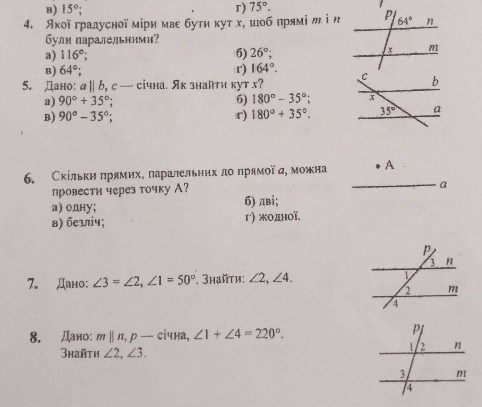 Дано: т || п, р— січна, 21 + 4 = 220°. Знайти 22, 23. Відповідь: 22 = 180° - 4° = 176°, 23 = 180° - 21° = 159°.