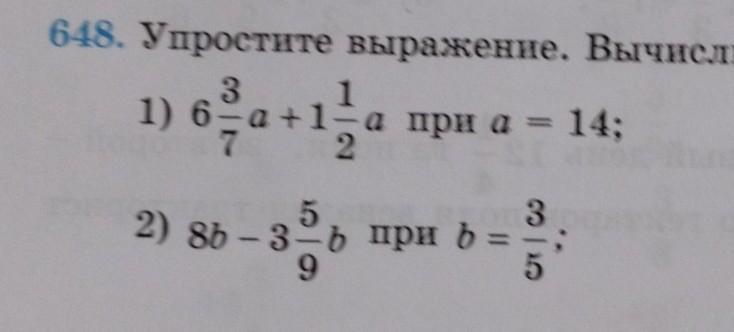 648. Упростите выражение. Вычислите значения выражений: 6(целых) 3/7 а+1(целых)1/2 при-а=14