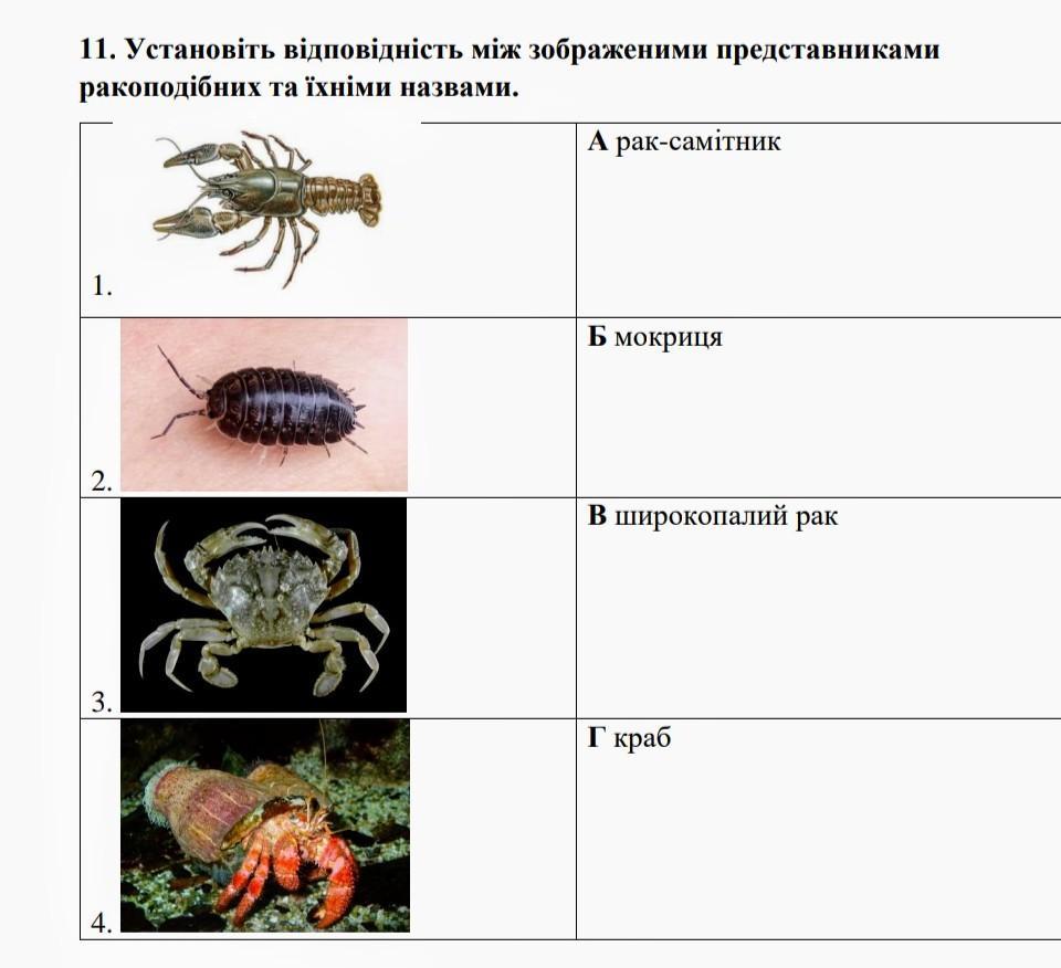 Установіть відповідність між зображеними представниками ракоподібних та їхніми назвами. 1. А рак-самітник 2. Б мокриця 3. В широкопалий рак 4. Г краб срочнооо