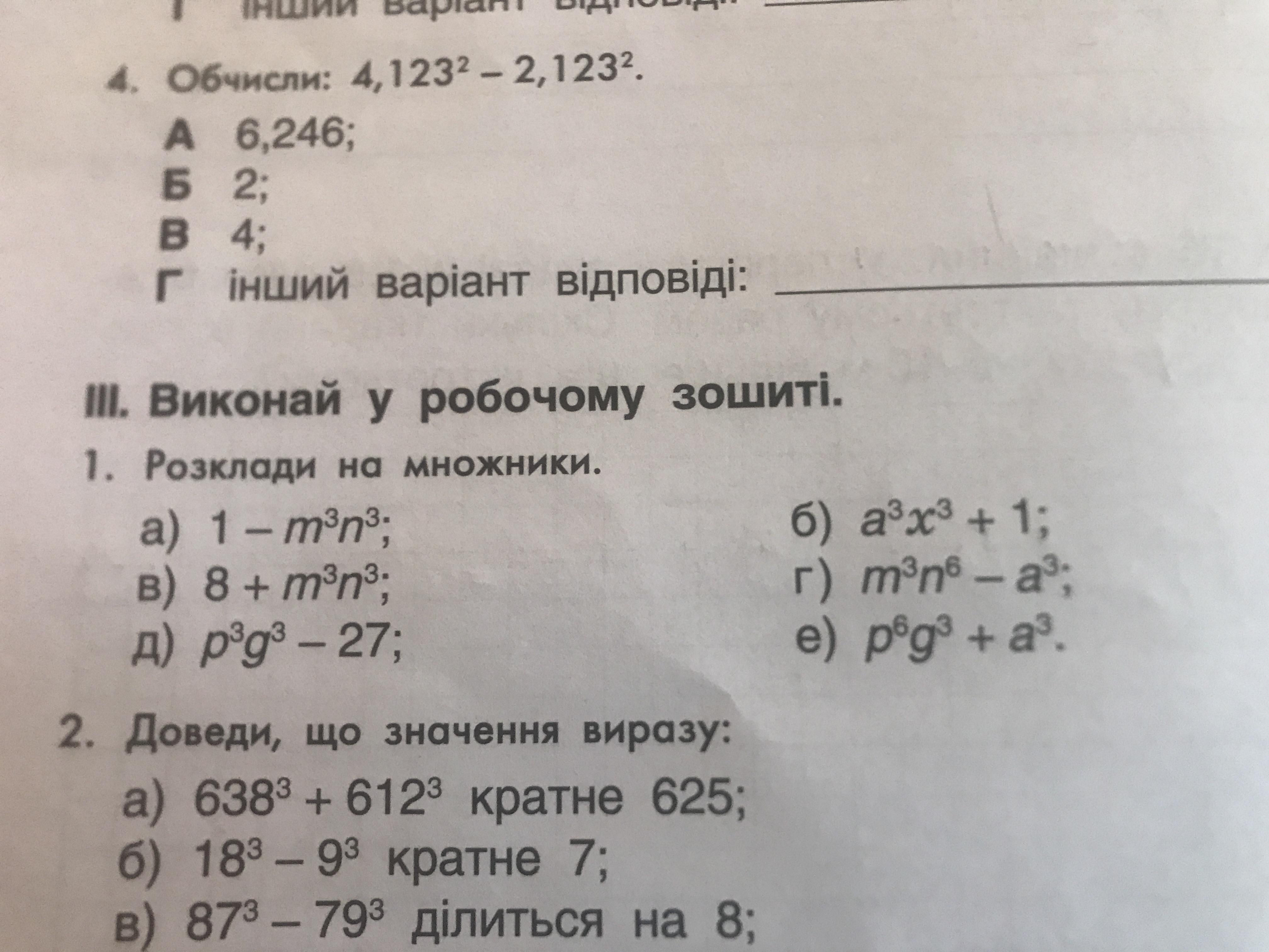 тут потрібно використовувати ФСМ (формулу скороченого множення), у прикладах а, г, д використовуємо a³-b³=(a-b)(a²+ab+b²), а в прикладах б, в, е використовуємо a³+b³=(a+b)(a²-ab+b²), а також не забуваємо, що 1=1²=1³ і (nᵃ)ᵇ=nᵃᵇ