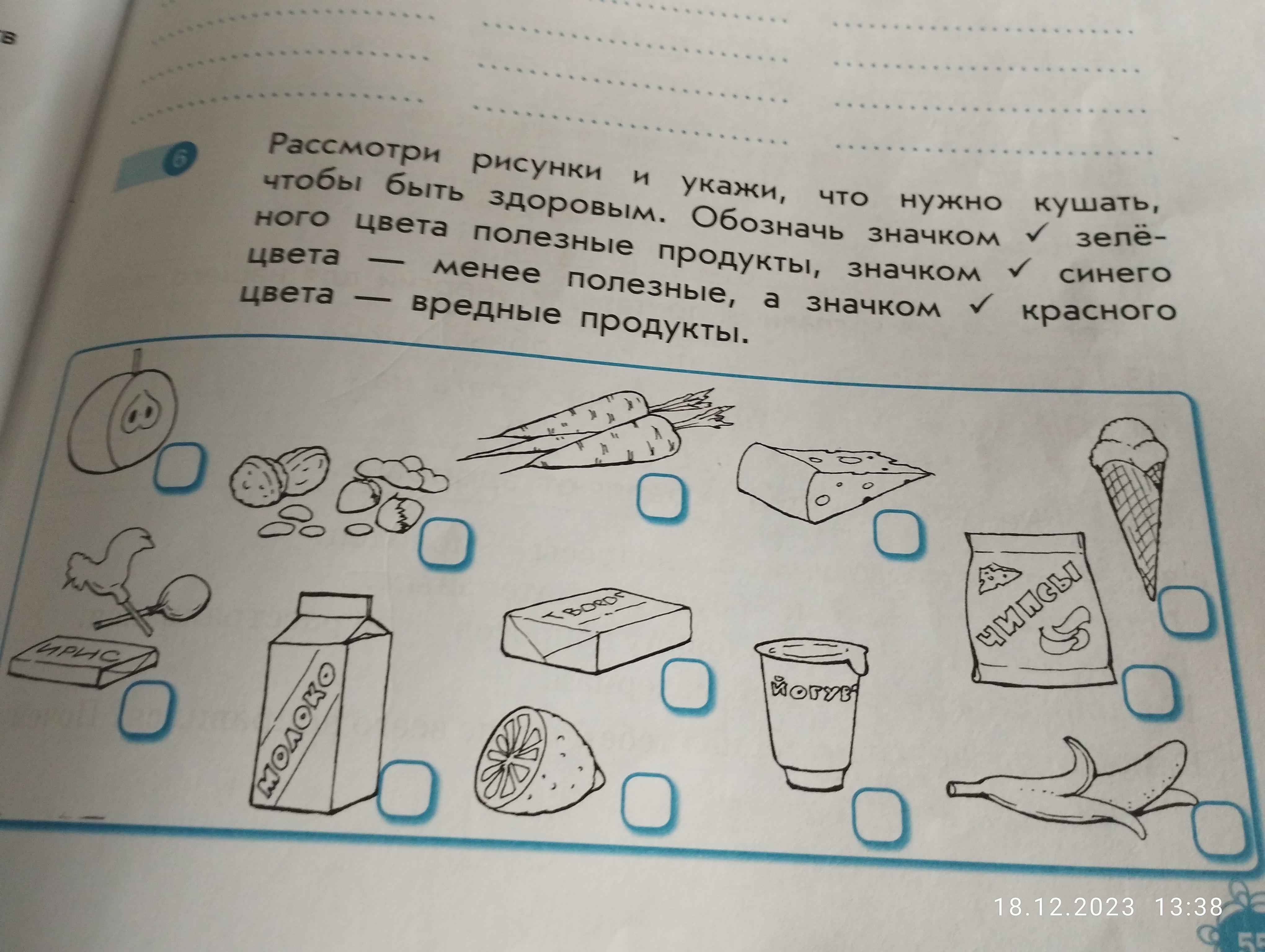Рассмотри рисунки и укажи, что нужно кушать, чтобы быть здоровым. Обозначь значком ✓ зелёного цвета полезные продукты, значком ✓ синего цвета - менее полезные, а значком ✓ красного цвета - вредные продукты.