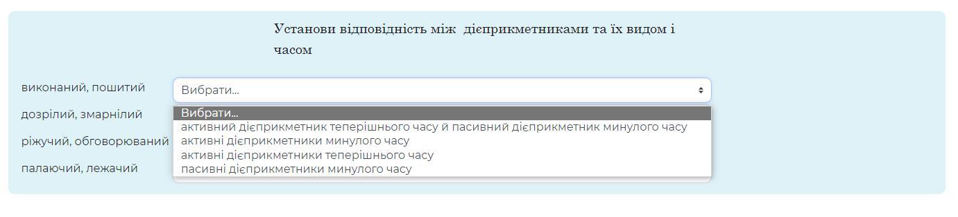 Установи відповідність між дієприкметниками та їх видом і часом