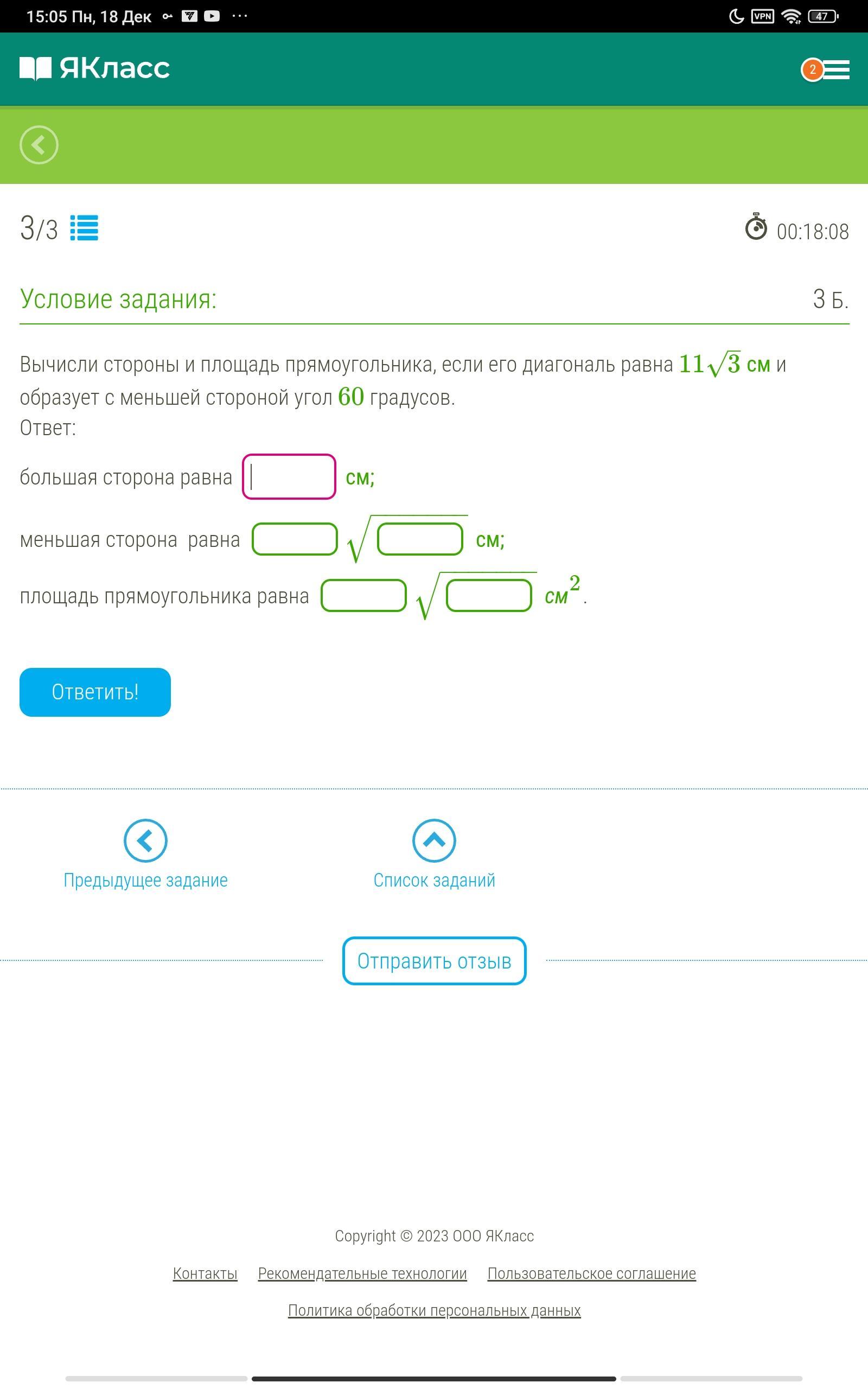 11√3 см, меньшая сторона равна 11 см, площадь прямоугольника равна