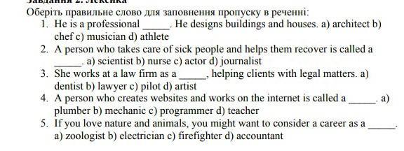 Оберіть правильне слово для заповнення пропуску в реченні: 1. He is a professional_ He designs buildings and houses. a) architect b) chef c) musician d) athlete 2. A person who takes care of sick people and helps them recover is called a a) scientist b) nurse c) actor d) journalist 3. She works at a law firm as a dentist b) lawyer c) pilot d) artist 4. A person who creates websites and works on the internet is called a plumber b) mechanic c) programmer d) teacher 5. If you love nature and animals, you might want to consider a career as a a) zoologist b) electrician c) firefighter d) accountant ___, helping clients with legal matters. a)