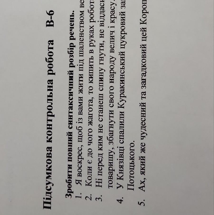 1. Я воскрес, щоб із вами жити під шаленством весняних злив. .2. Коли є до чого жагота, то кипить в руках робота. 3. Ні перед ким не станеш спину гнути, не віддасися ворогу в ясу, якщо ти міг, товаришу, збагнути свого народу велич і красу. 4. У Князівці спалили Куракинський цукровий завод, а в Пісках - маєток графа 5. Ах, який же чудесний та загадковий цей Коропів хутір.