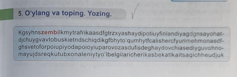 5. O'ylang va toping. Yozing. Kgsyhnszembilkmytrafrikaasdfgtrzxyashaydipotiuyfinlandiyagdgnsayohat- djchuygvavtobuskietndschiqdikgfbhyto'qumhytfcalishercfyurimehmonasdf- ghsvetoforpoiupiyodapoioyiuparovozasdufisdeghaydovchiasediyguvohno- mayujdsreqkutubxonaleniytyo'l belgilaricherikas bekatlkaitsaqichheudjuk deb