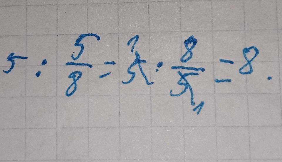 5 : 5/8 = 5 * 8/5 = 40/5 = 8