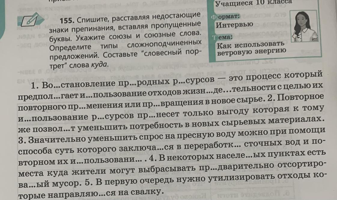 155. Спишите, расставляя недостающие знаки препинания, вставляя пропущенные буквы. Укажите союзы и союзные слова.