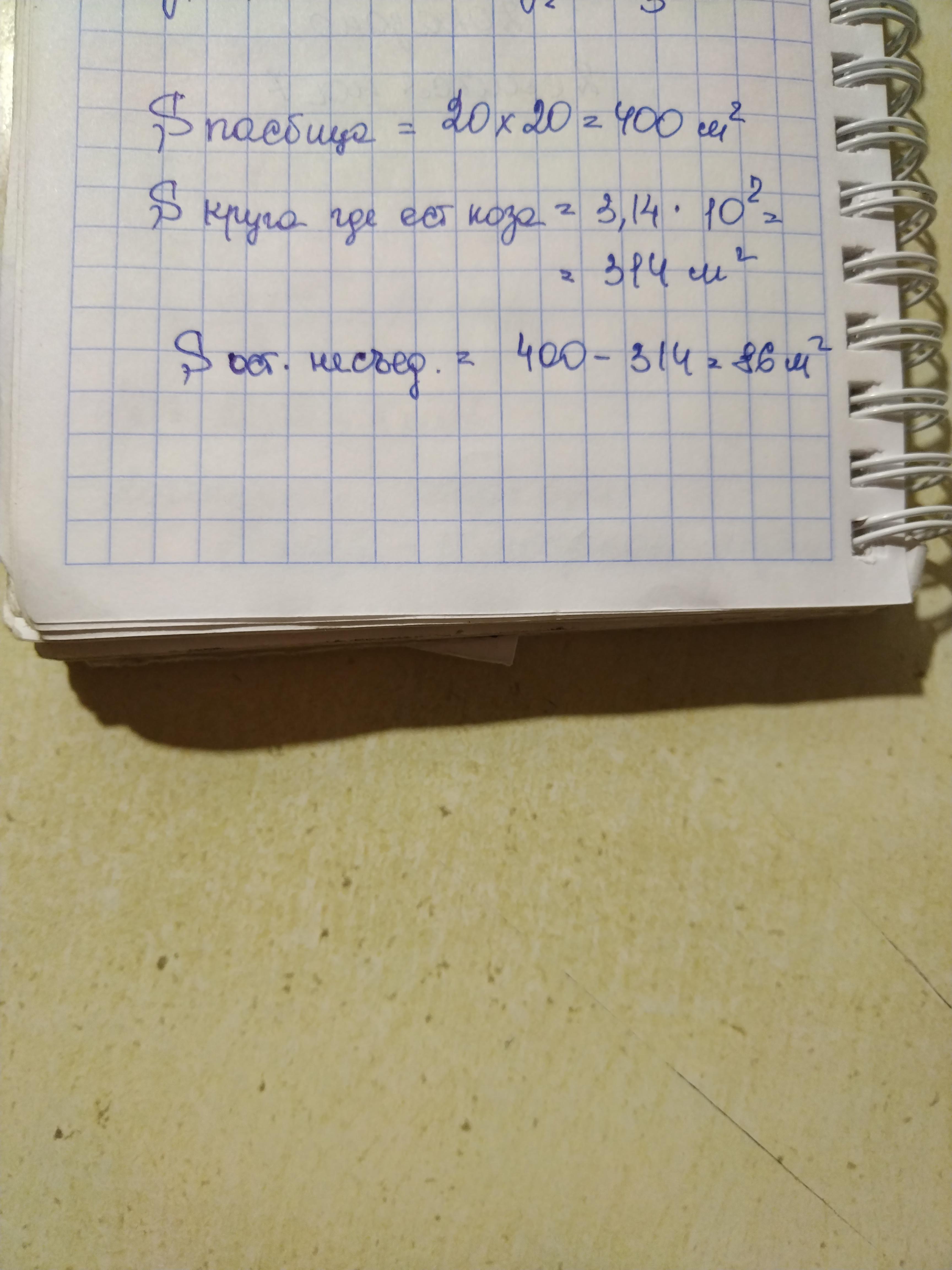 Прочитайте текст справа. Задание 1. Математика PISA-ориентированный тест 6 класс Найдите площадь пастбища, на котором останется трава, несъеденная козой. Справочный материал: Площадь круга S=лг², где л-3,14 Выберите один верный ответ: A) 86 м² Б) 314 м² B) 400 м² Г) 1256 м²