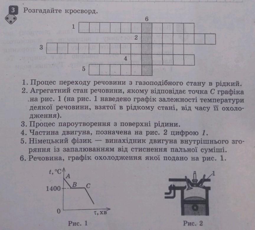 3 Розгадайте кросворд. 3 t, °C 1400- 0 1 A 1. Процес переходу речовини з газоподібного стану в рідкий. 2. Агрегатний стан речовини, якому відповідає точка С графіка .на рис. 1 (на рис. 1 наведено графік залежності температури деякої речовини, взятої в рідкому стані, від часу її охоло- дження). 3. Процес пароутворення з поверхні рідини. 4. Частина двигуна, позначена на рис. 2 цифрою 1. 5. Німецький фізик винахідник двигуна внутрішнього зго- ряння із запалюванням від стиснення пальної суміші. 6. Речовина, графік охолодження якої подано на рис. 1. 5 в с Рис. 1 BAYO 2 - 4 T, XB 6 К Рис. 2 Срочно пожалуйста помогите