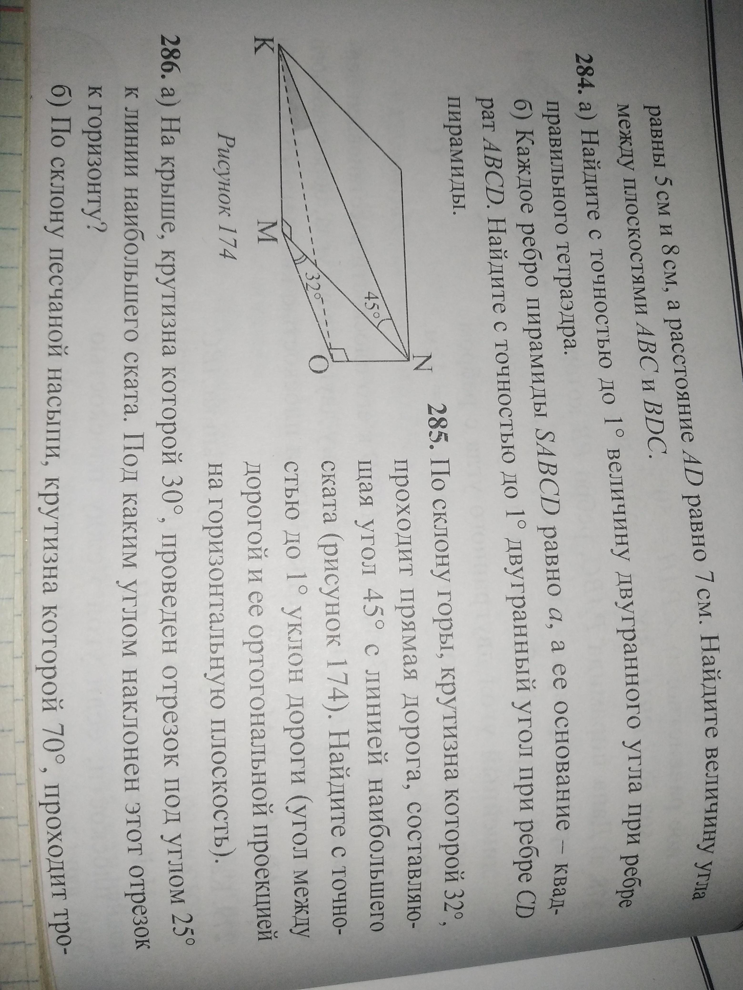 285. По склону горы, крутизна которой 32° проходит прямая дорога, составляющая угол 45° с линией наибольшего ската (рисунок 174). Найдите с точностью до 1° уклон дороги (угол между дорогой и ее ортогональной проекцией на горизонтальную плоскость)