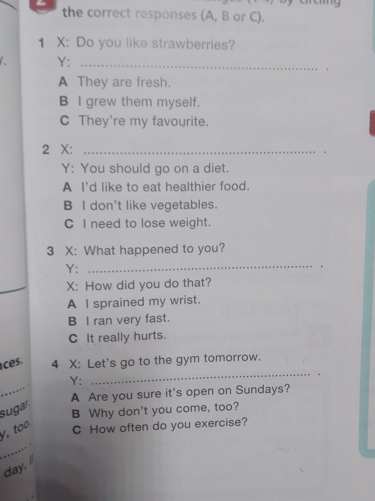t 2* Complete the exchanges (1-4) by circling the correct responses (A, B or C A They are fresh B I grew them myself. B I don't like vegetables. X: How did you do that? A I sprained my wrist. B I ran very fast. C It really hurts. 4 X: Let's go to the gym tomorrow. A Are you sure it's open on Sundays? B Why don't you come, too? C How often do you exercise?срочно пж даю 100