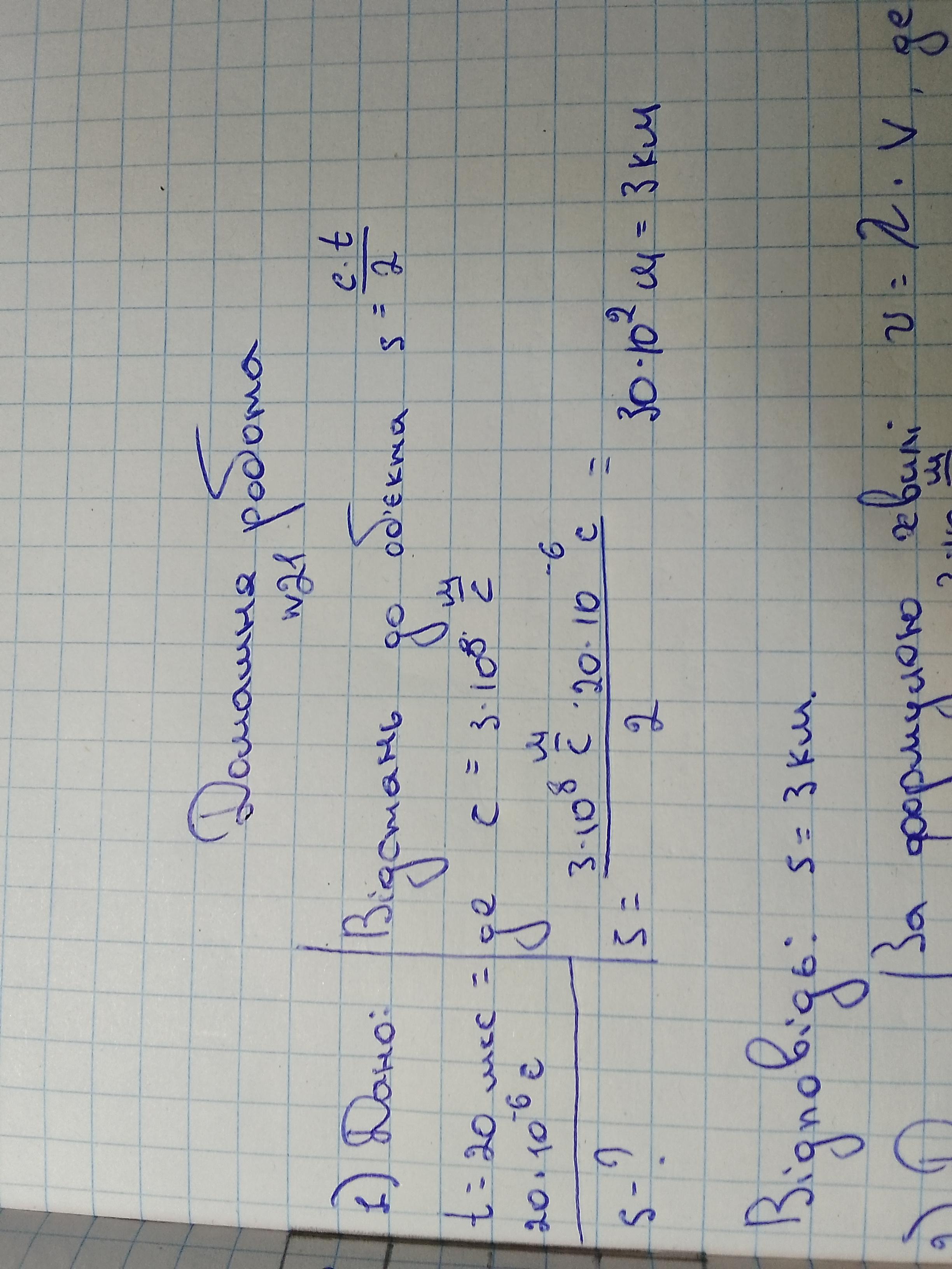 1. На якій відстані виявлено об'єкт, якщо відбитий сигнал повернувся через 20 мкс після посилання?