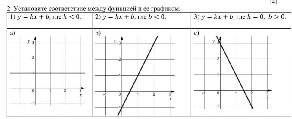 2. Установите соответствие между функцией и ее графиком. 1) y = kx + b, где к < 0. 2) y = kx + b, где b < 0. b) a) 23 _22_3_ О 3) y = kx + b, где k = 0, b > 0. c) к