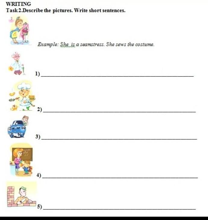 WRITING Task 2. Describe the pictures. Write short sentences. Example: She is a seamstress. She sews the costume. фото даю 12б