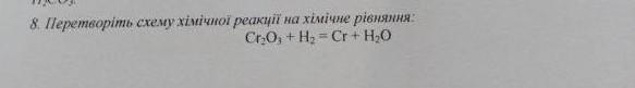 Схему хімічної реакції "Cr₂O₃ + H₂ = Cr + H₂O" можна перетворити на хімічне рівняння, враховуючи збереження маси та заряду. Враховуючи, що реакція відбувається в кислому середовищі, додамо водень на сторону зменшення заряду: