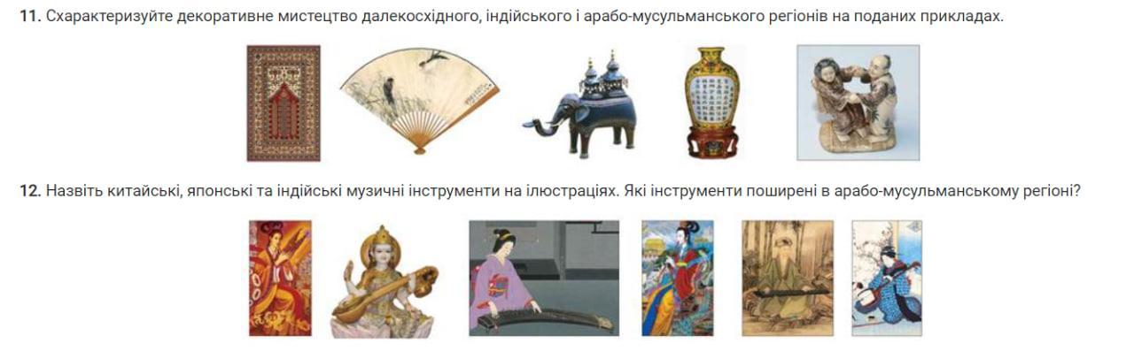 12. Назвіть китайські, японські та індійські музичні інструменти на ілюстраціях. Які інструменти поширені в арабо-мусульманському регіоні?
