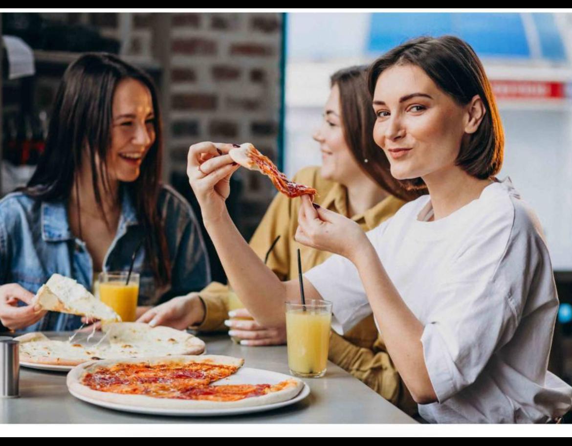 three friends went to a pizzeria. And they ordered pizza with cheese and pepperroni with juice. They laughed together.