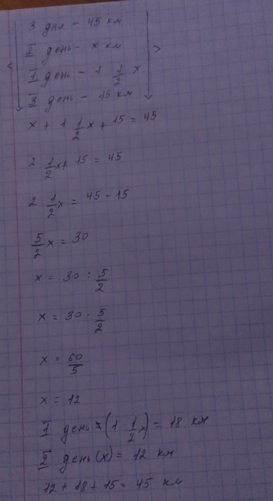 33. Туристы за три дня прошли 45 км. В первый день они прошли в 1 раза больше длины пути, чем во второй 1 2 день, а в третий день 15 км. Сколько километров прошли туристы в первый день?