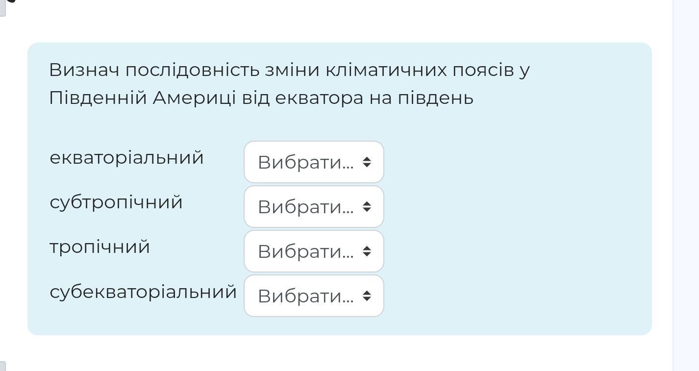 Визнач послідовність зміни кліматичних поясів у Південній Америці від екватора на південь