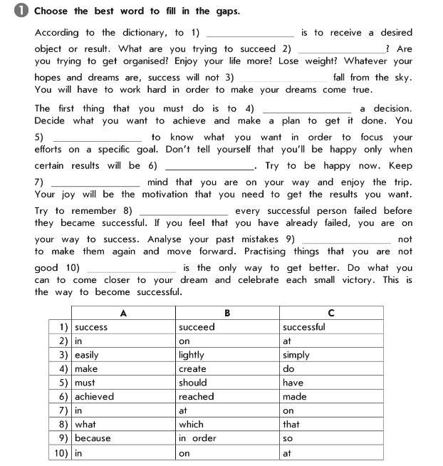 According to the dictionary, to **succeed** is to receive a desired object or result. What are you trying to succeed **in**? Whatever your hopes and dreams are, success will not **easily** fall from the sky. You will have to work hard in order to make your dreams come true. The first thing that you must do is to **make** a decision. Decide what you want to achieve and make a plan to get it done. You **should** know what you want in order to focus your efforts on a specific goal. Don't tell yourself that you'll be happy only when certain results **are achieved.** Try to be happy now. Keep in mind that you are on your way and enjoy the trip. Your joy will be the motivation that you need to get the results you want. Try to remember **that** every successful person failed before they became successful. If you feel that you have already failed, you are on your way to success. Analyze your past mistakes **in order** not to make them again and move forward. Practicing things that you are not good **at** is the only way to get better. Do what you can to come closer to your dream and celebrate each small victory. This is the way to become **successful.**