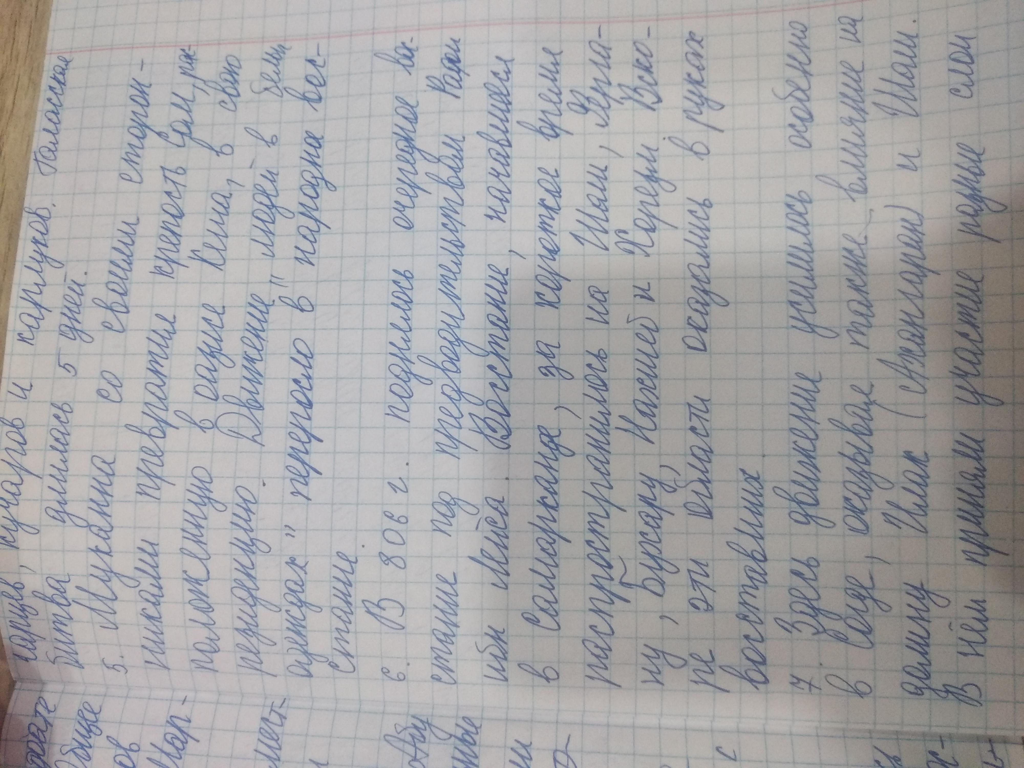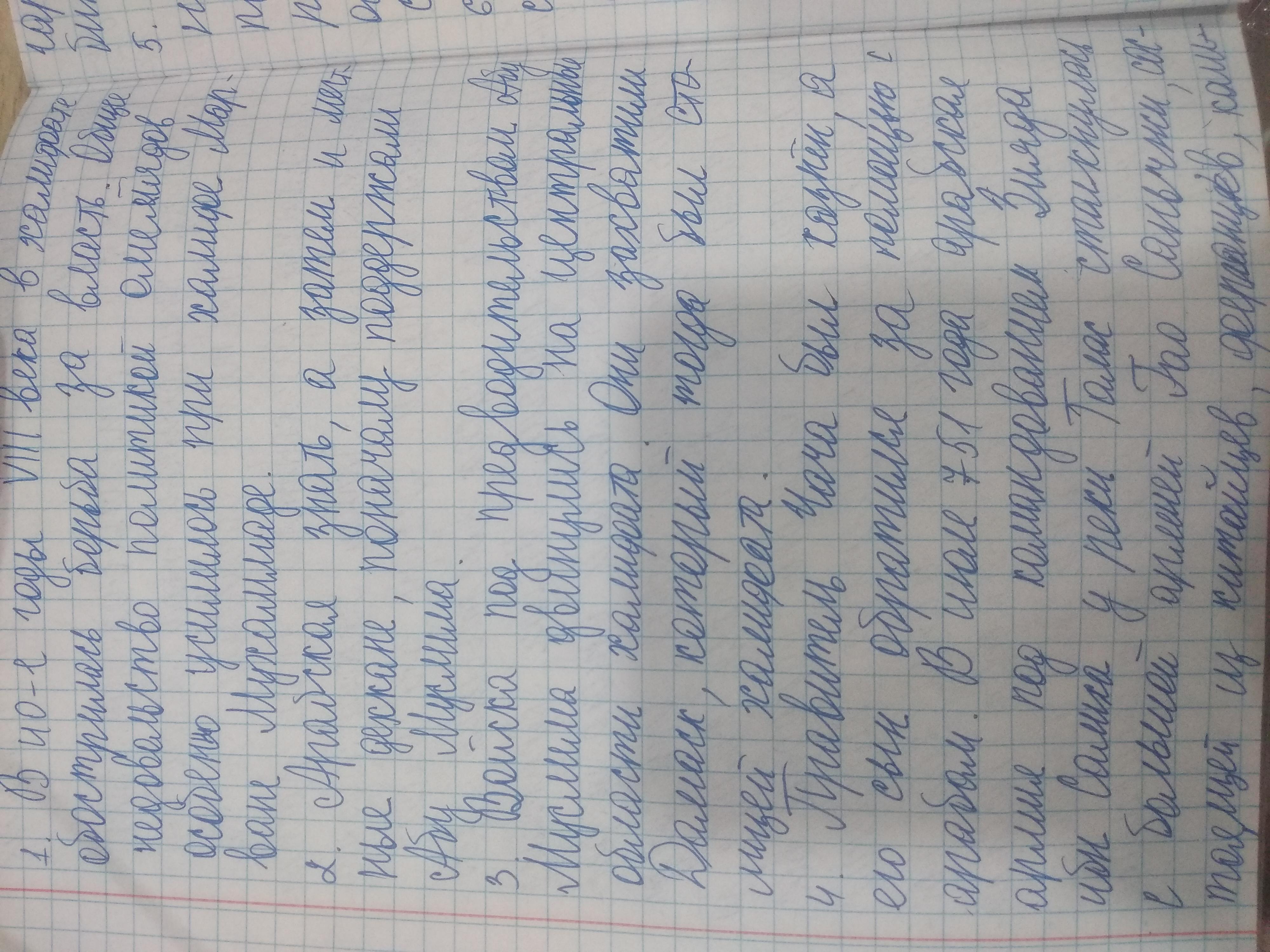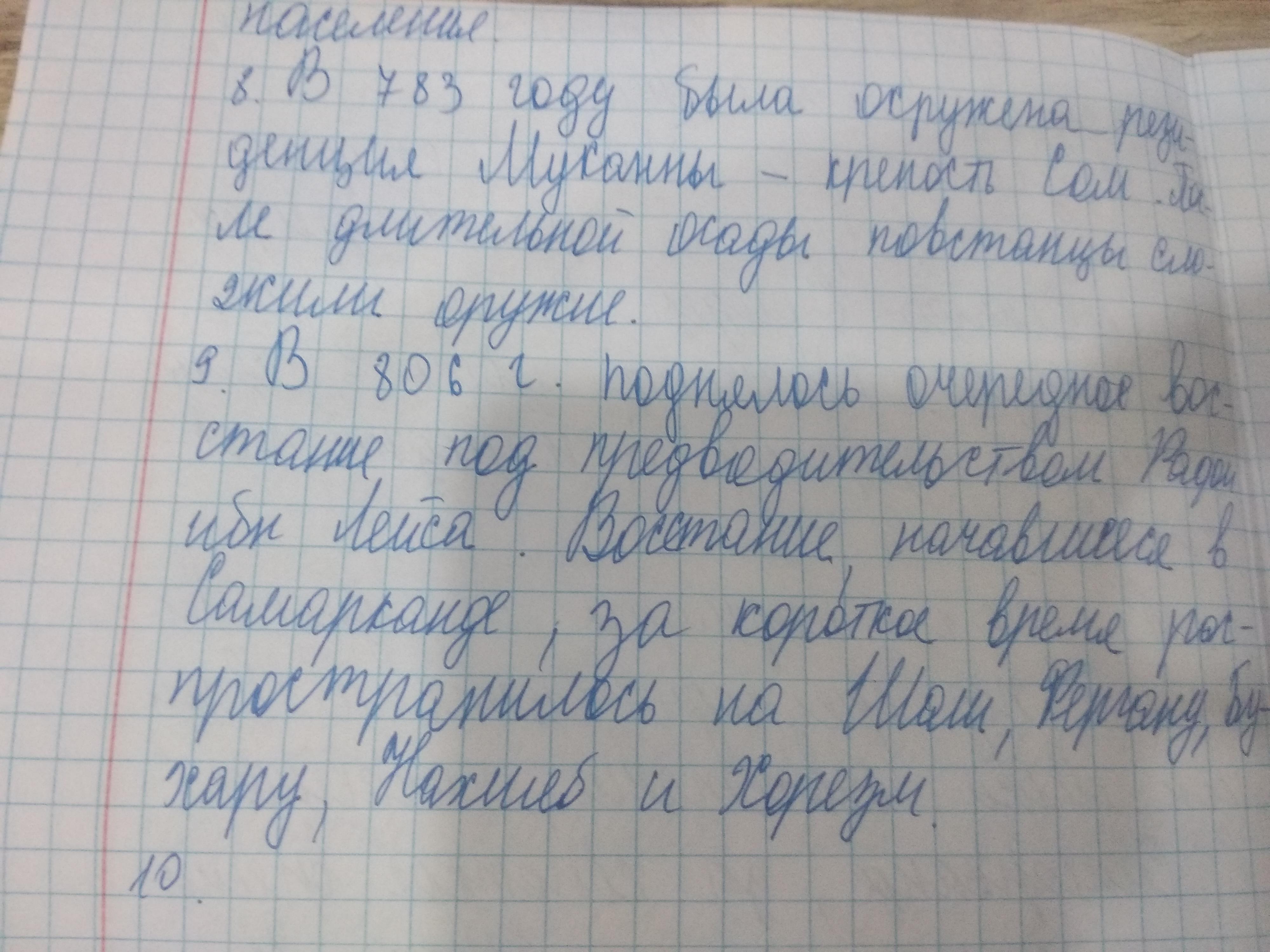 1. В 40-х годах VIII века всеобщее недовольство правившими Аббасидами чрезвычайно возросло, особенно в период правления халифа Марвана Мухаммеда. 2. Сначала Абу Муслима поддерживают арабские купцы, затем местные фермеры. 3. Армия Абу Муслима направляется в сторону центральных провинций халифата и захватывает столицу халифата город Мовароуннахр. 4. Воспользовавшись конфликтом между Ферганской Ихшида и Чач, Иран в 751 году начал поход на Туран. Абу Муслим послал против них армию арабов и туранцев под предводительством Зияда ибн Салиха. 5. В конце X века восстание в Моваруннахре называют восстанием «людей в белых одеждах>>. 6. Рофе ибн Лайс возглавил восстание «людей в белых одеждах>>. 7. Движение «людей в белых одеждах>> особенно растёт в Марве и оказывает своё влияние также на долину Илак (Ахангаран) и Шаш. 8. В 788 году была осаждена резиденция Муканны в крепости Сом. После длительной осады повстанцы сдаются. 9. В 806 г. под предводительством Рофе ибн Лейса вспыхнуло новое восстание против халифата. Восстание началось в Бухаре и распространилось на Шашскую, Ферганскую, Бухарскую, Нахшабскую и Хорезмскую области. 10. Луки, производимые в Хорезме, керамика из Чача и хлеб из Самарканда были самыми известными и БЕСЦЕННЫМИ