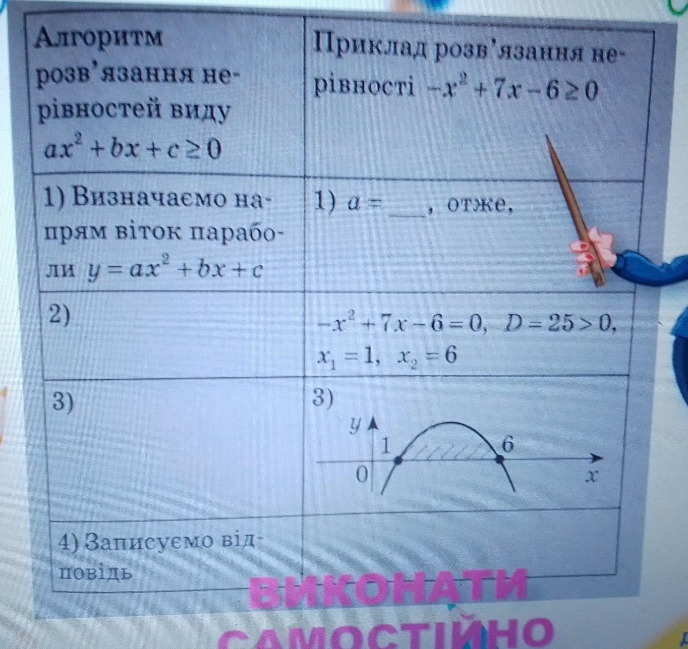 Графіком нерівності - є парабола з вітками вгору. Тобто менше або дорівнювати нулю, вона буде на проміжку від першого перетину з віссю Ox до другого. А це є проміжок [1;6]