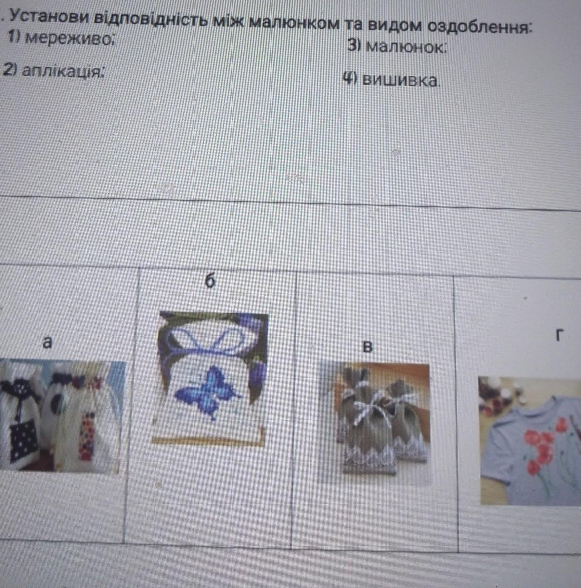 11. Установи відповідність між малюнком та видом оздоблення: 1) мереживо: 3) малюнок: 2) аплікація; 4) вишивка.