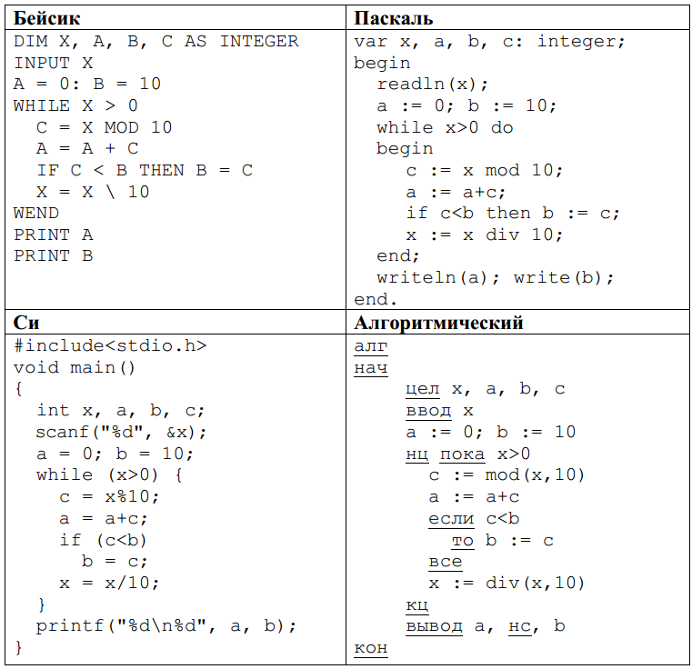 Ниже на четырёх языках записан алгоритм. Получив на вход число x, этот алгоритм печатает два числа: a и b. Укажите наименьшее из таких чисел x, при вводе которых алгоритм печатает сначала 13, а потом 5.