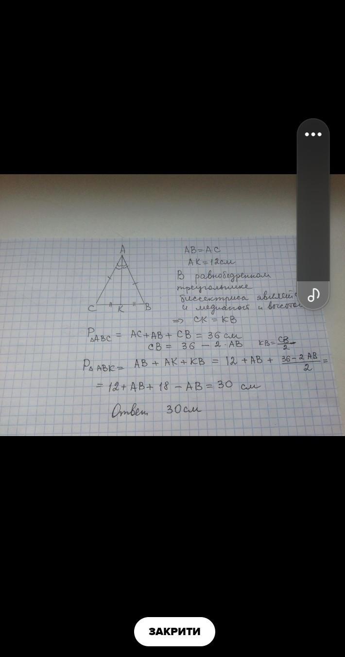 ДАН равнобедренный треугольник ABC, у которого AB=AC. Его периметр равен 36см. Биссектриса AK равна 10см. Найдите периметр треугольника ABK. СРООООЧНОООО!!!!!