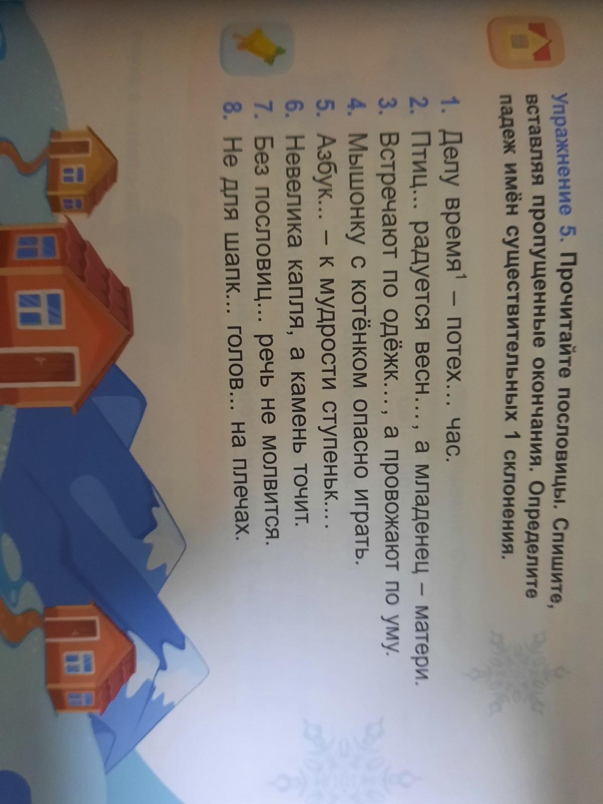 Упражнение 5. Прочитайте пословицы. Спишите, вставляя пропущенные окончания. Определите падеж имен существительных 1 склонения. 1. Делу время¹ - потех... час.