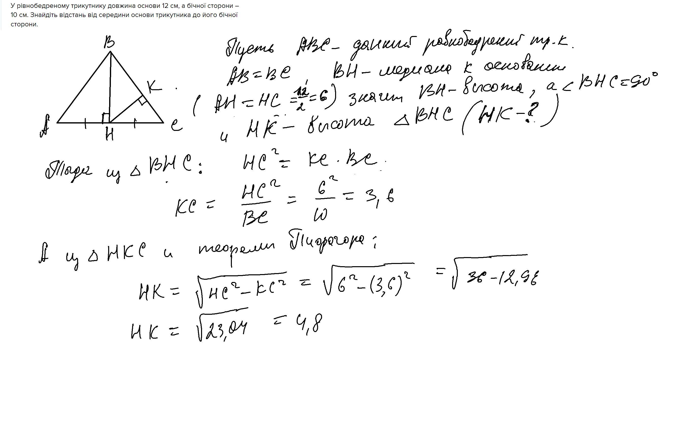 У рівнобедреному трикутнику довжина основи 12 см, а бічної сторони – 10 см. Знайдіть відстань від середини основи трикутника до його бічної сторони.