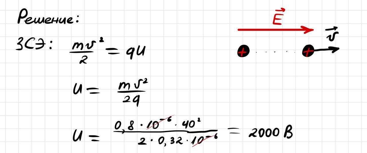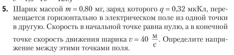 5. Шарик массой m = 0,80 мг, заряд которого q = 0,32 мкКл, пере- мещается горизонтально в электрическом поле из одной точки в другую. Скорость в начальной точке равна нулю, а в конечной M C точке скорость движения шарика v = 40 Определите напря- жение между этими точками поля.