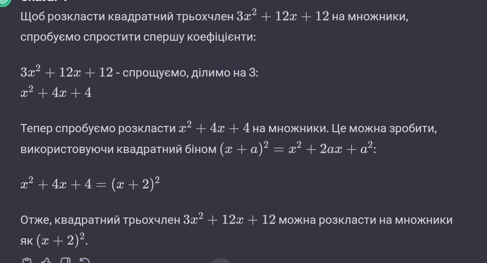 Отже, розкладаємо \(3x^2 + 12x + 12\) на множники: