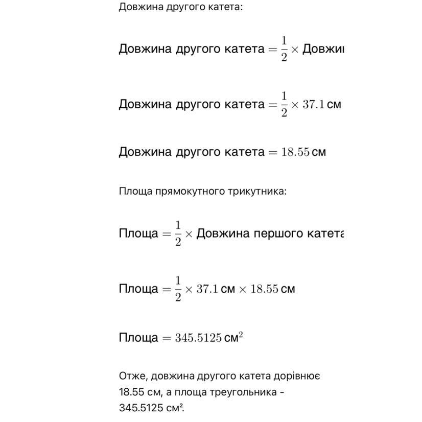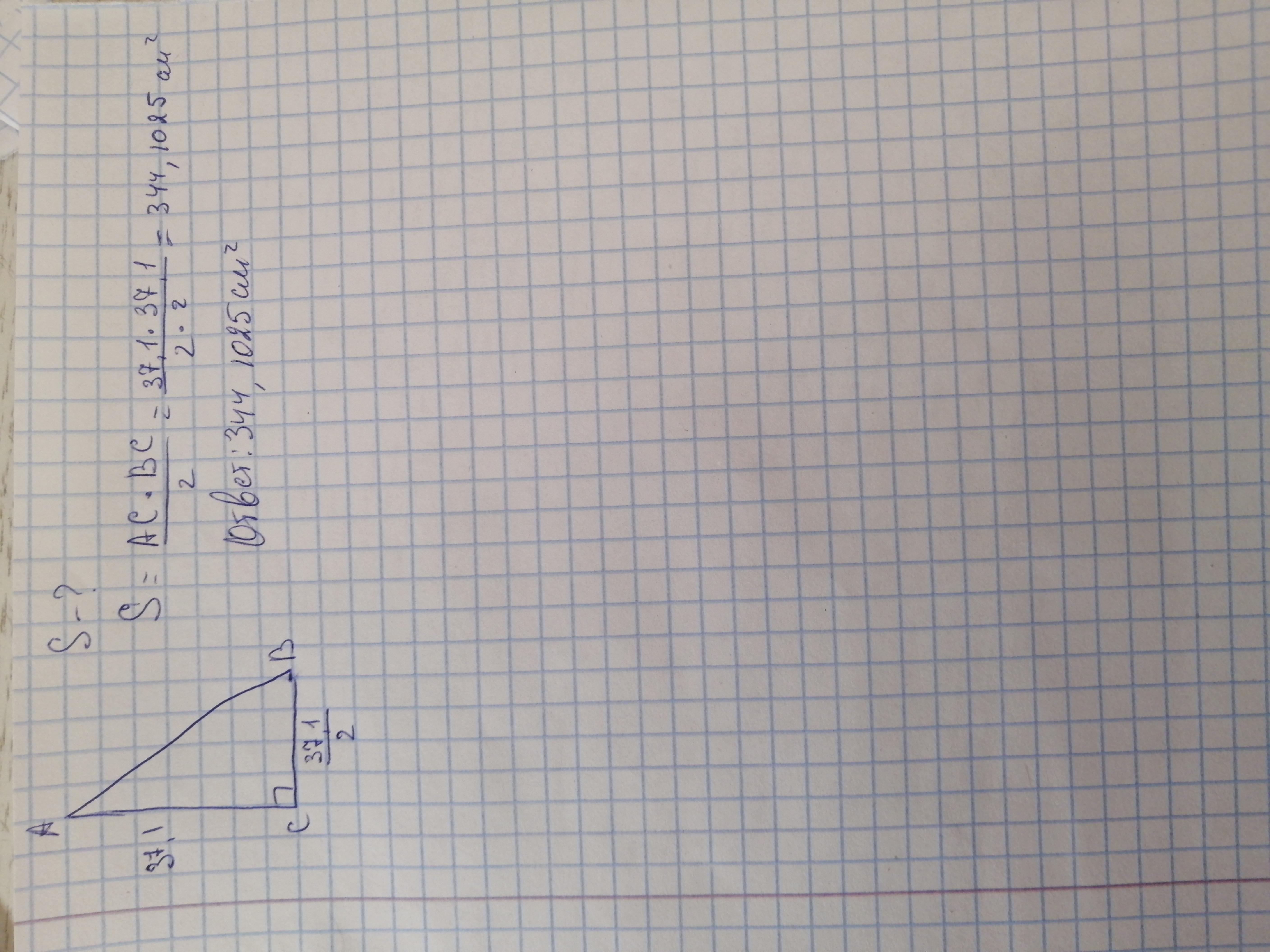 Дан прямоугольный треугольник. Длина первого катета равна 37,1 см, а второй составляет 1/2 часть от длины первого. Найди площадь треугольника.