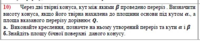 СРОЧНО ПОЖАЛУЙСТА 10) Через дві твірні конуса, кут між якими в проведено переріз . Визначити висоту конуса, якщо його твірна нахилена до площини основи під кутом а., а площа вказаного перерізу дорівнює Q.